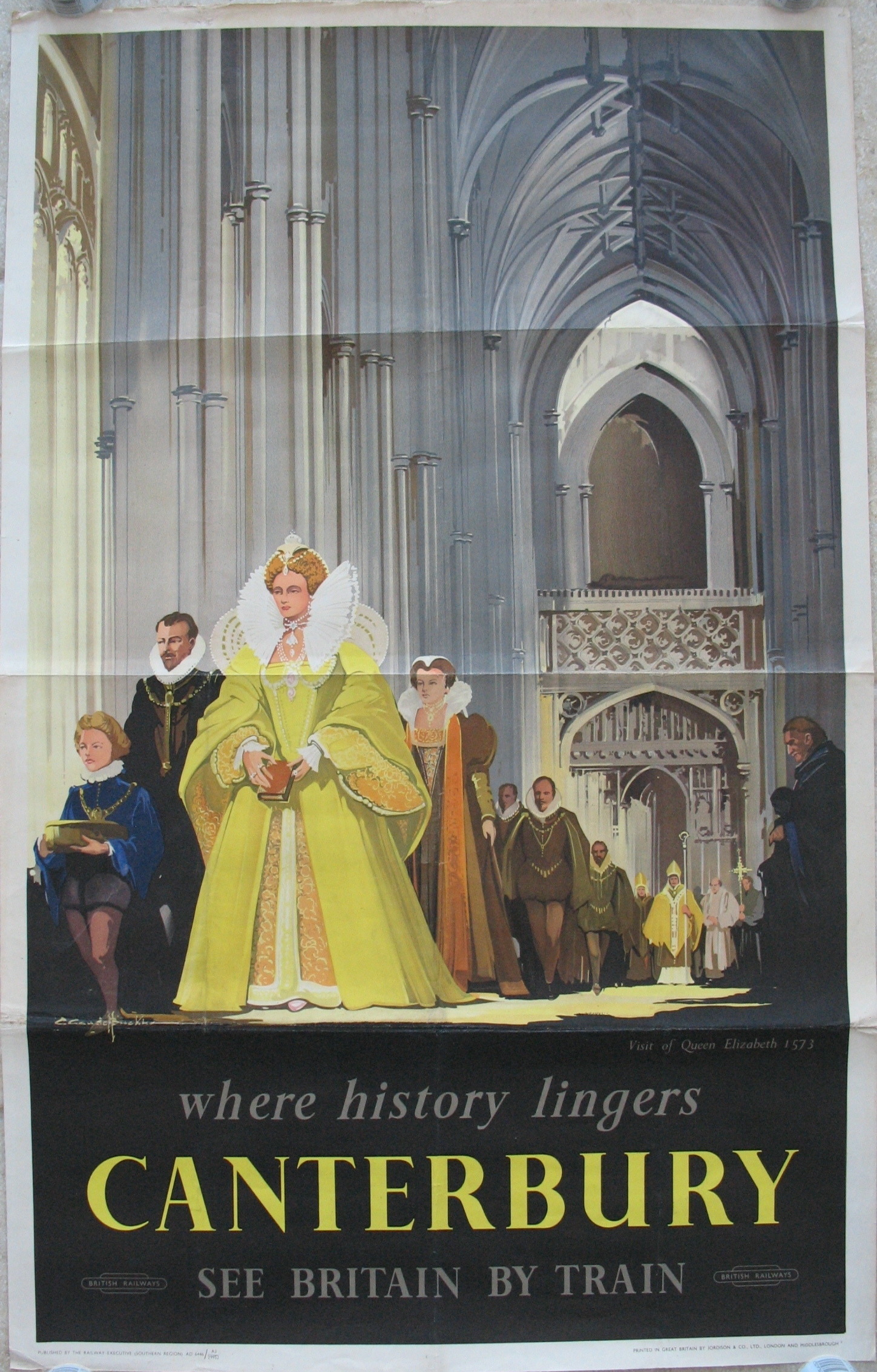 Description - Queen Elizabeth I is depicted at the front of a procession inside the towering cathedral. Buckle produced a small series of these historical posters in the 1950s.