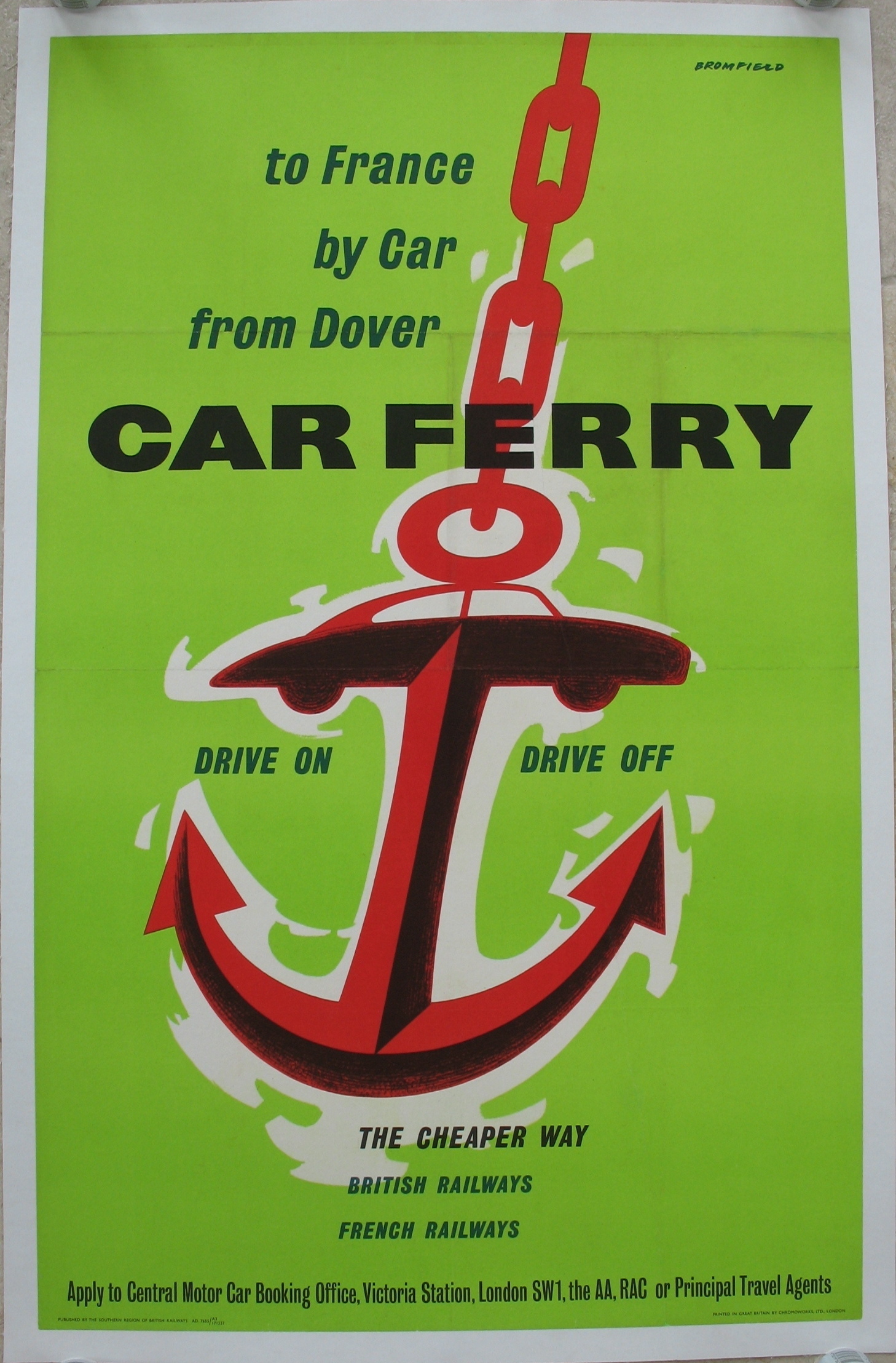 Description - A stylised car is seen as part of the anchor in Bromfield's simple and bright poster for the Car Ferry service from Dover, jointly operated by British and French Railways. The drive-on/drive-off ferry terminal at Dover was opened in 1953.