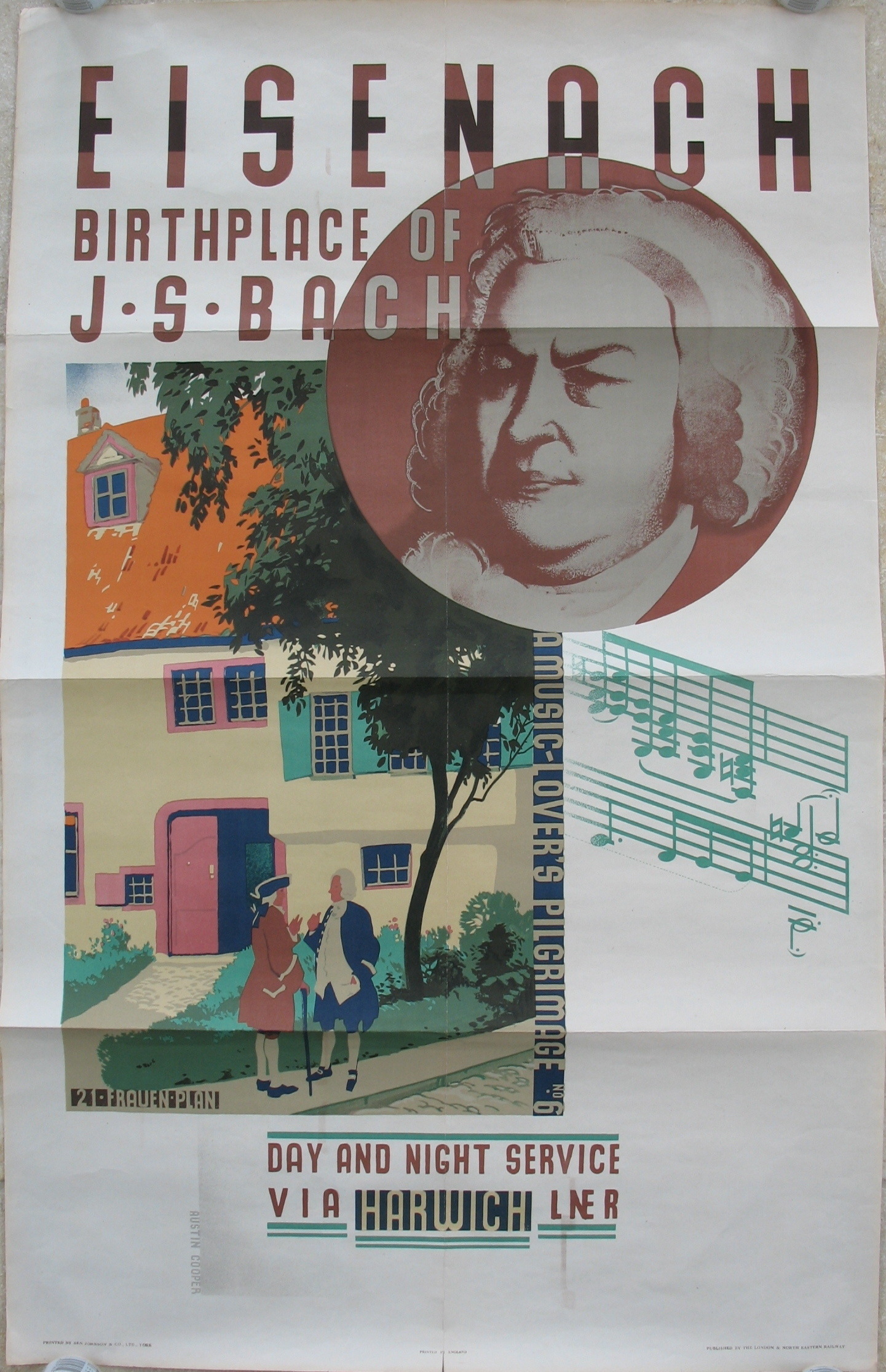 Description - An unusual montage poster design, No 6 in a series entitled "A Music-Lover's Pilgrimage", incorporating Johann Sebastian Bach's head, a painting of what was believed to be the house where Bach was born, and an excerpt from a piece of his music.