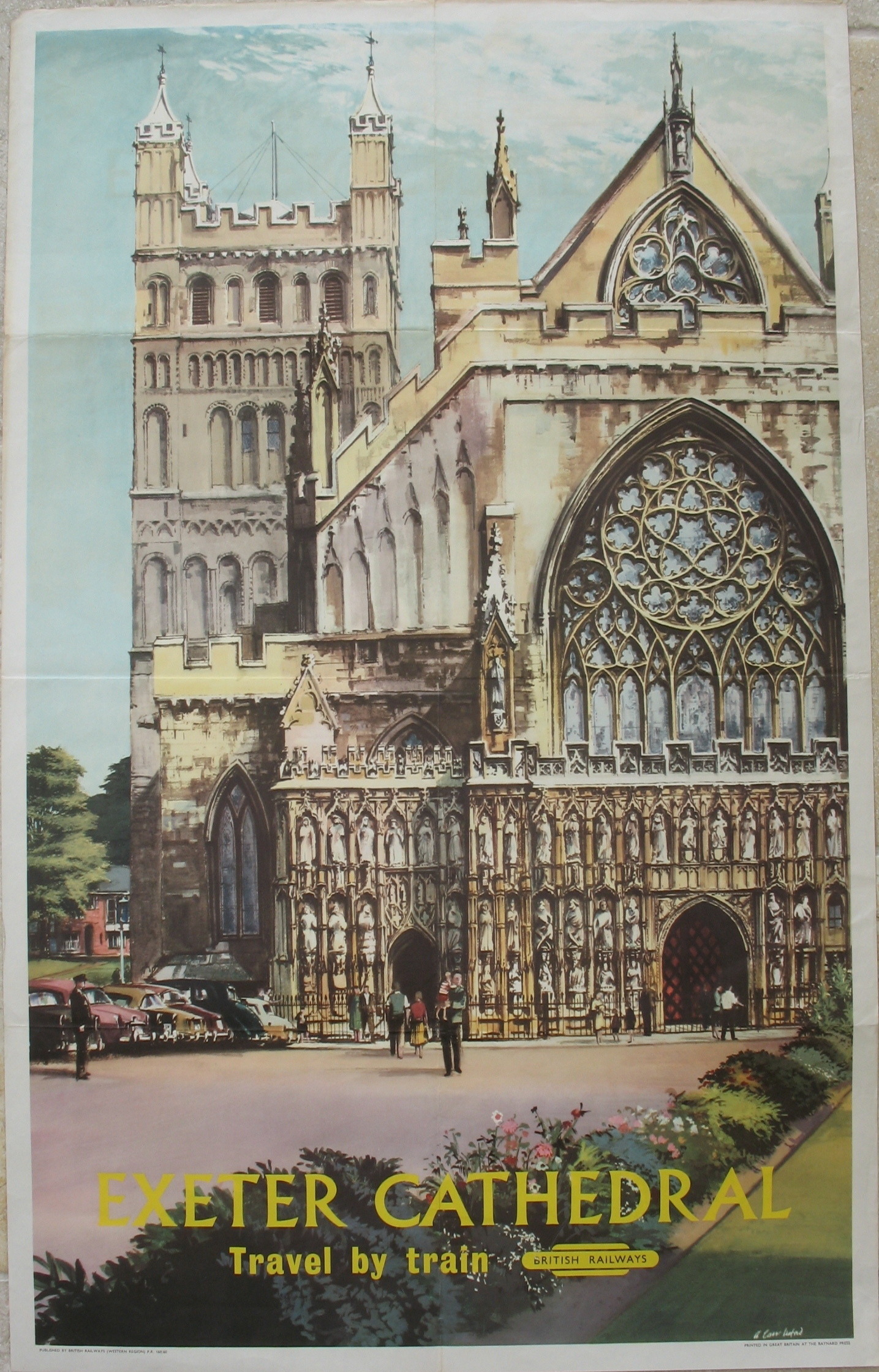 Description - A fabulous view of the very ornate west front of the gothic cathedral. Seen in front of the building are a line of contemporary cars and a few people outside the doors, and a neat herbaceous border.