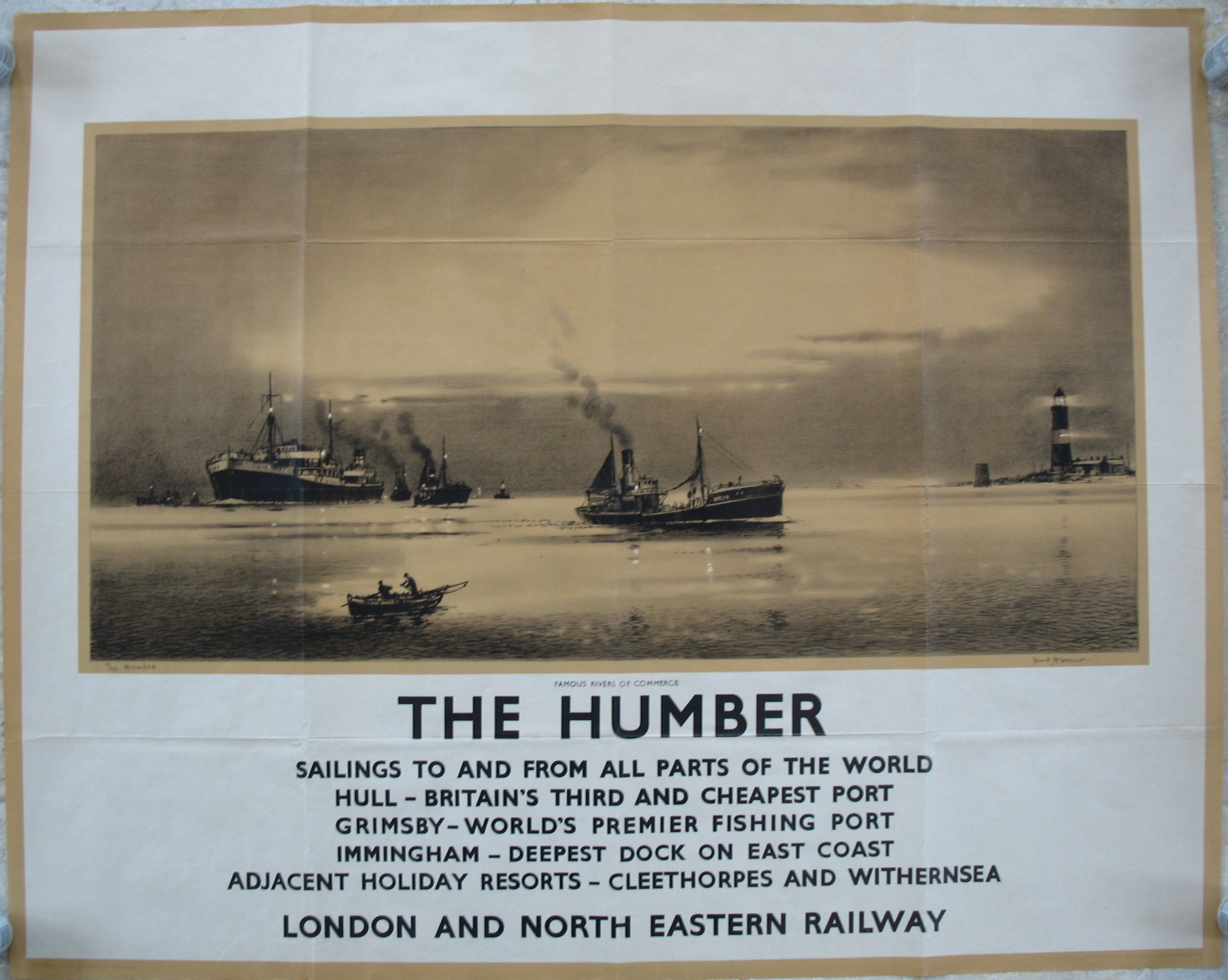 Description - This is one of a series of golden-brown and sepia style images of the activity in major east coast rivers, painted by Mason in 1932, emphasising the business and industrial work of the LNER. It gives some details of the ports of Hull, Grimsby and Immingham. There is also a quick reminder of the nearby seaside resorts Cleethorpes and Withernsea, just in case the holidaymakers saw the posters! There is a mixture of shipping on show, right down to a small fishing boat in the foreground.