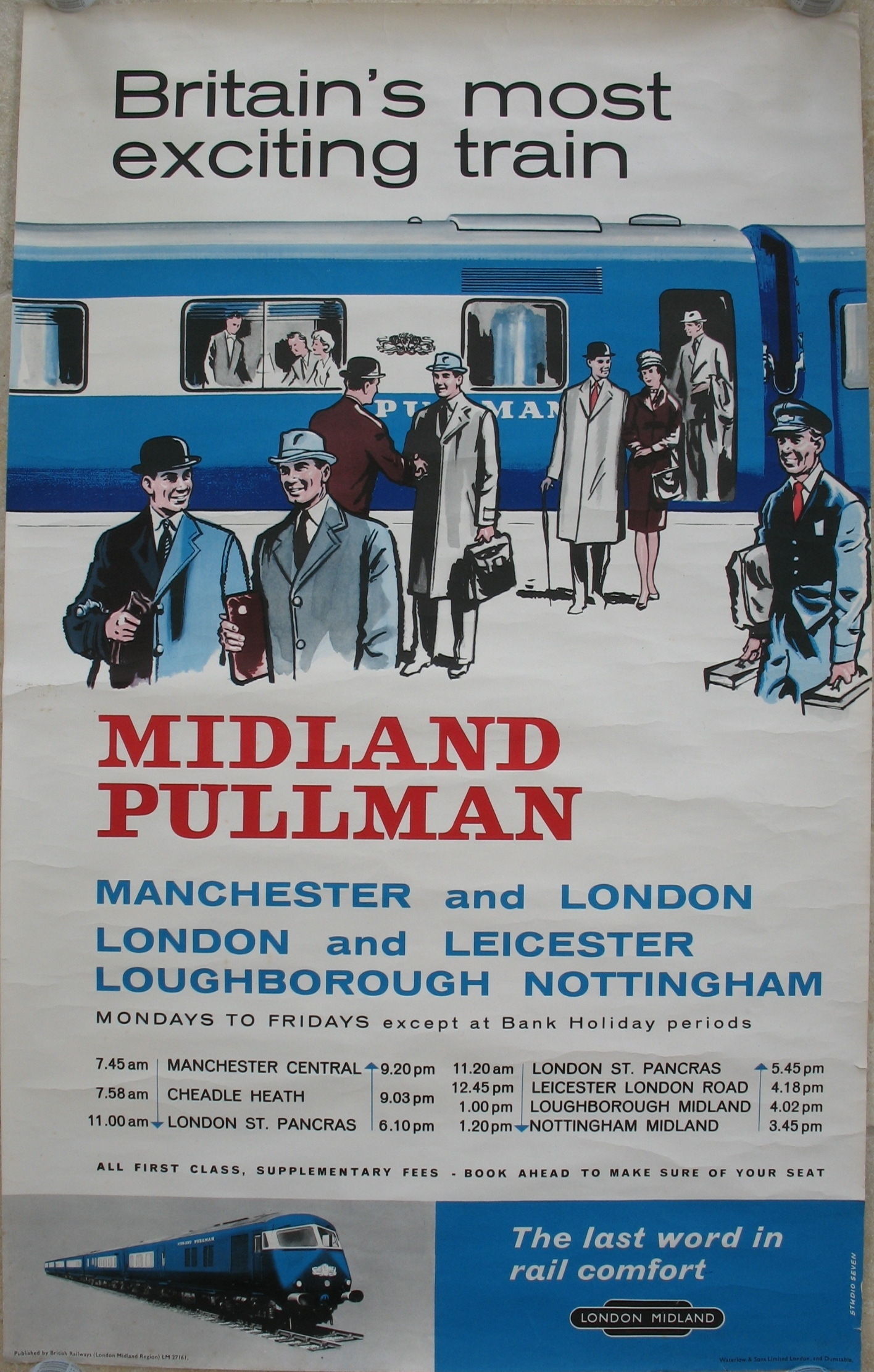Description - The first Blue Pullmans were introduced on the London Midland Region in 1960, with this poster produced in 1961 to encourage patronage by showing an artistic view of smiling businessmen and a well-dressed couple alighting from the train and a smiling porter carrying luggage. At the bottom is a basic timetable and an outside view of the train.
