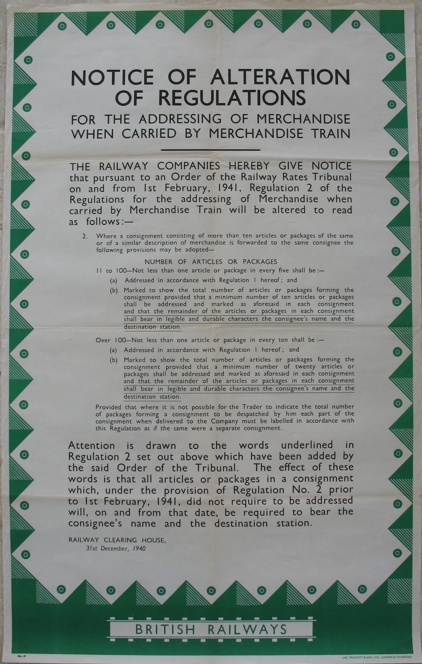 Description - One of many wartime posters produced by the railway authorities to inform businesses and the general public. This poster was issued by The Railway Executive Committee on 31st December 1940, under the name of "British Railways", to advise that Merchandise regulations were changing on 1st February 1941.