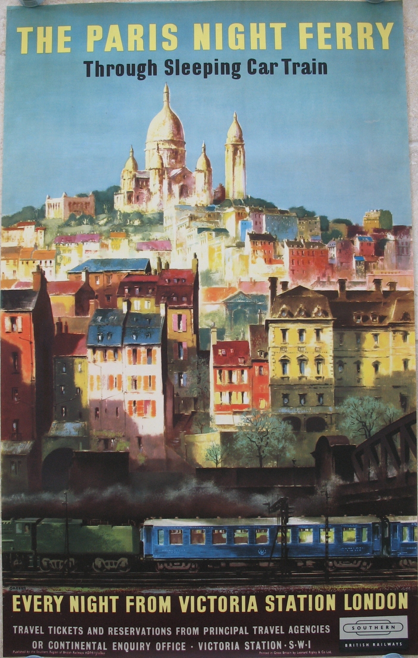 Description - The full Night Ferry journey took 7 hours in the 1950s, seen here in the cutting approaching Paris' Gare Du Nord in early morning sunshine, complete with a green steam locomotive leading the train. The aeriel viewpoint would be from the buildings between Rue Max Dormoy and the railway (or maybe floating above!). Greene's lovely impressionist painting shows the Basilique du Sacré-Cœur de Montmartre on the hill above the colourful houses, apartments and studios of Montmartre's historic area that had been home to many famous artists. This example came from the family of the artist, having been stored since the original commission.