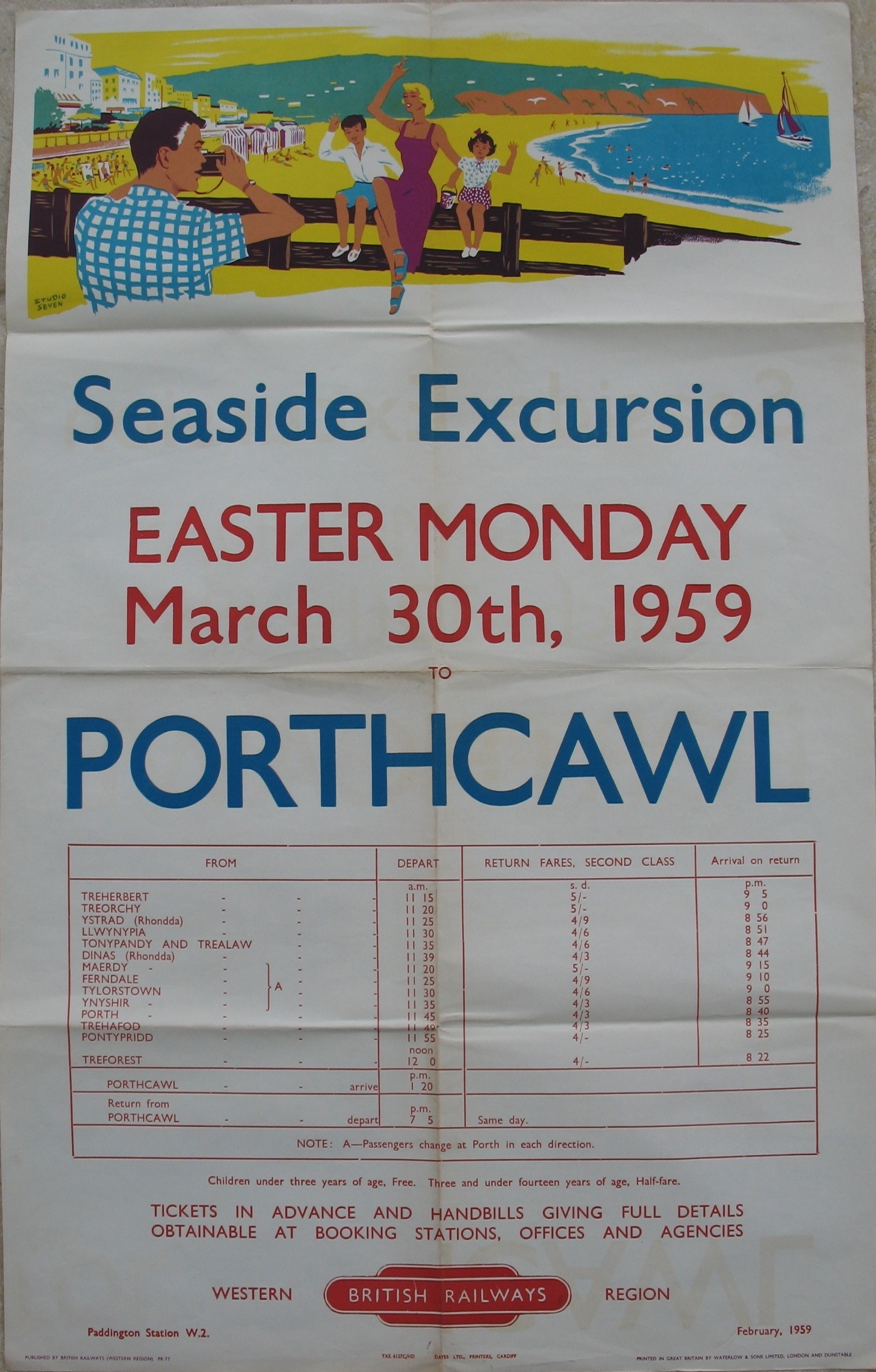 Description - This poster for Easter Excursions to Porthcawl uses a "Stock" image of a generic view of a family enjoying the seaside. British Railways would have had a large number of these posters printed with just the image, and then they would have been run through the printers again to add whatever wording was required at the time. This way one poster image could be reused many times and for many events over a number of years.