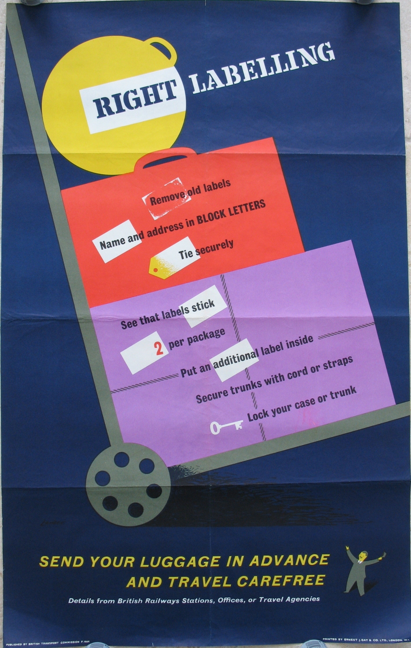 Description - A simple clever design, involving a hat case, suitcase and a roped package, with various types of labels attached and lots of simple instructions covering the requirements for correct labelling of items going by train. They are all stacked on a porter's trolley.
