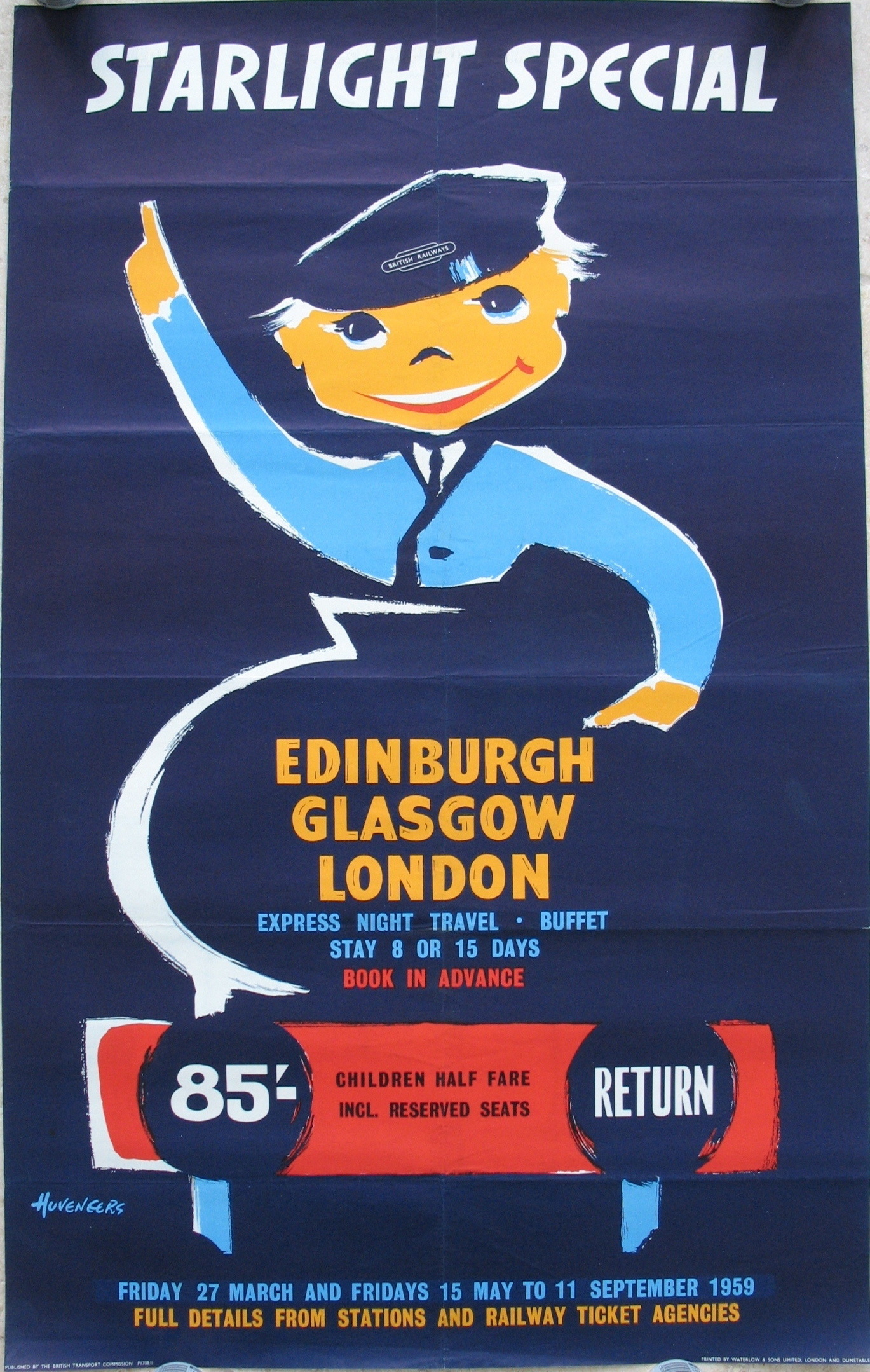 Description - A fabulous cartoon style design for the summer season (plus Easter weekend) non-sleeper overnight service between London and Scotland. The smiling cartoon British Railways worker appears to be coming out of the chimney of a steam locomotive. The service had run since 1953, with a number of advertising posters produced to promote it.